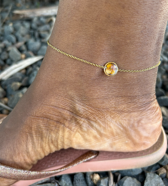Ce bijou en acier inoxydable doré renferme de vraies fleurs naturelles, cueillies, séchées et résinées à la main. Chaque fleur est différente par sa forme et sa couleur : c’est ce qui rend chaque pièce absolument unique.