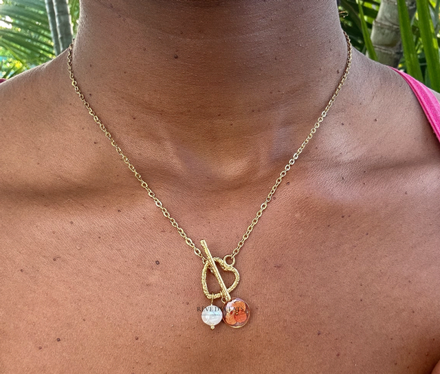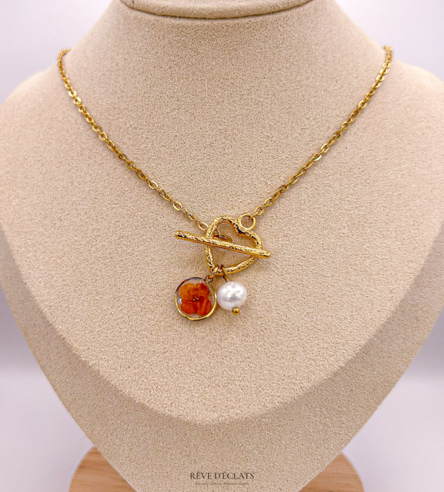 Ce bijou en acier inoxydable doré renferme de vraies naturelles, cueillies, séchées et résinées à la main. Chaque fleur est différente par sa forme et sa couleur : c’est ce qui rend chaque pièce absolument unique.