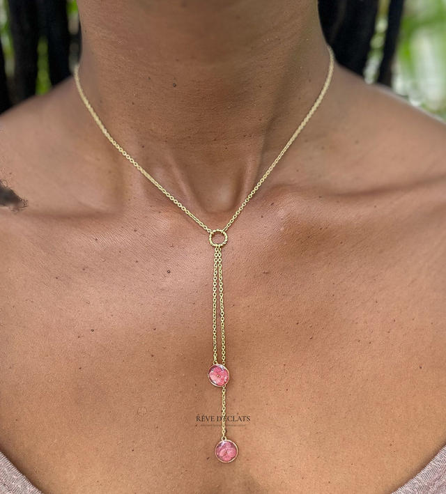 Ce bijou en acier inoxydable doré renferme de vraies fleurs naturelles, cueillies, séchées et résinées à la main. Chaque fleur est différente par sa forme et sa couleur : c’est ce qui rend chaque pièce absolument unique.